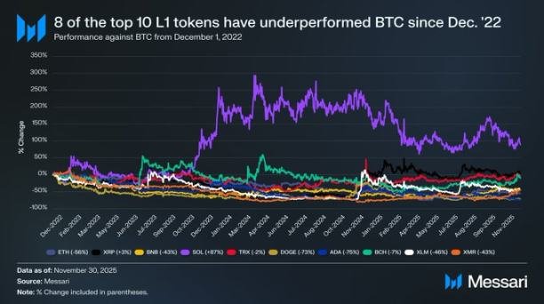 我们将市值前十的 L1 代币(不含 HYPE)作为 L1 板块的代表,考察了它们自 2022 年 12 月 1 日以来相对于比特币的表现。这十种资产约占 L1 总市值的 94%,足以代表整个板块。在此期间: