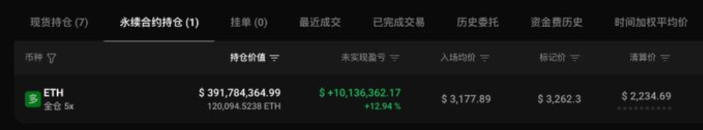 按当前价格计算,这些ETH价值约3.35亿美元,开仓均价为3158美元,目前已实现浮盈1705万美元,收益率达25.45%。