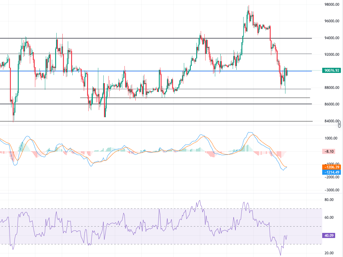 比特币、以太坊昨日盘中走出明显的回调后反弹修复行情,但整体表现依旧反复。晚间美盘阶段,多空来回拉扯明显,比特币价格多次在 87800–90300 区间内快速上下波动,短线节奏偏快但延续性不足;以太坊波动同样剧烈,价格在 2880–3030 区间内反复震荡,显示当前市场仍处于高度不稳定状态。