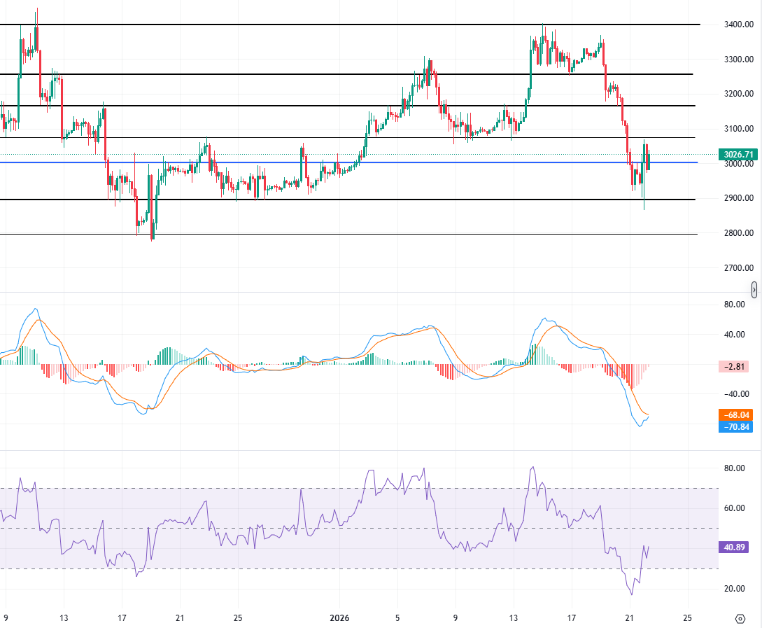 以太坊方面,结构与比特币基本同步,但相对波动幅度更大。短期上方阻力关注 3100 位置以及 3150 附近,这一区域也是此前反弹多次受阻的压力带;下方支撑继续关注 2930,2870 区域,若跌破该区间,回调风险将进一步放大,届时可能会再次向下测试2800-2650这些区域。