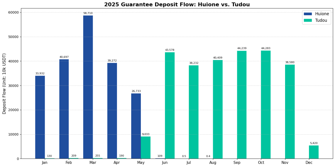 2025年汇旺担保链上总活跃地址数超 40 万,土豆担保活跃地址数超过 12 万。12 月受汇旺支付运营情况的影响,担保上押地址转入流水明显降低,此前汇旺支付曾用土豆担保的上押地址进行资金清洗的操作,也进一步佐证了汇旺和土豆担保之间的关联。 参考下图,自 2025 年 5 月汇旺担保封禁后,土豆担保的上押地址流入资金有明显上升。
