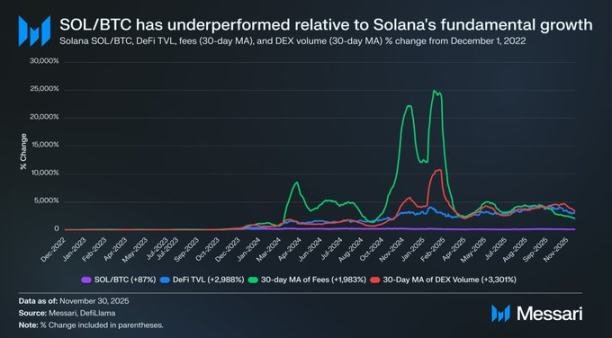 然而深入分析 SOL 的优异表现,我们发现它实际上可能「表现不佳」。在 SOL 跑赢比特币 87% 的同一时期,Solana 生态的基本面呈指数级增长:DeFi 总锁定价值增长 2,988%,手续费收入增长 1,983%,DEX 交易量增长 3,301%。以任何合理标准衡量,自 2022 年底以来,Solana 生态规模增长了 20 到 30 倍。但旨在捕获这一增长的资产 SOL,其价格仅跑赢比特币 87%。