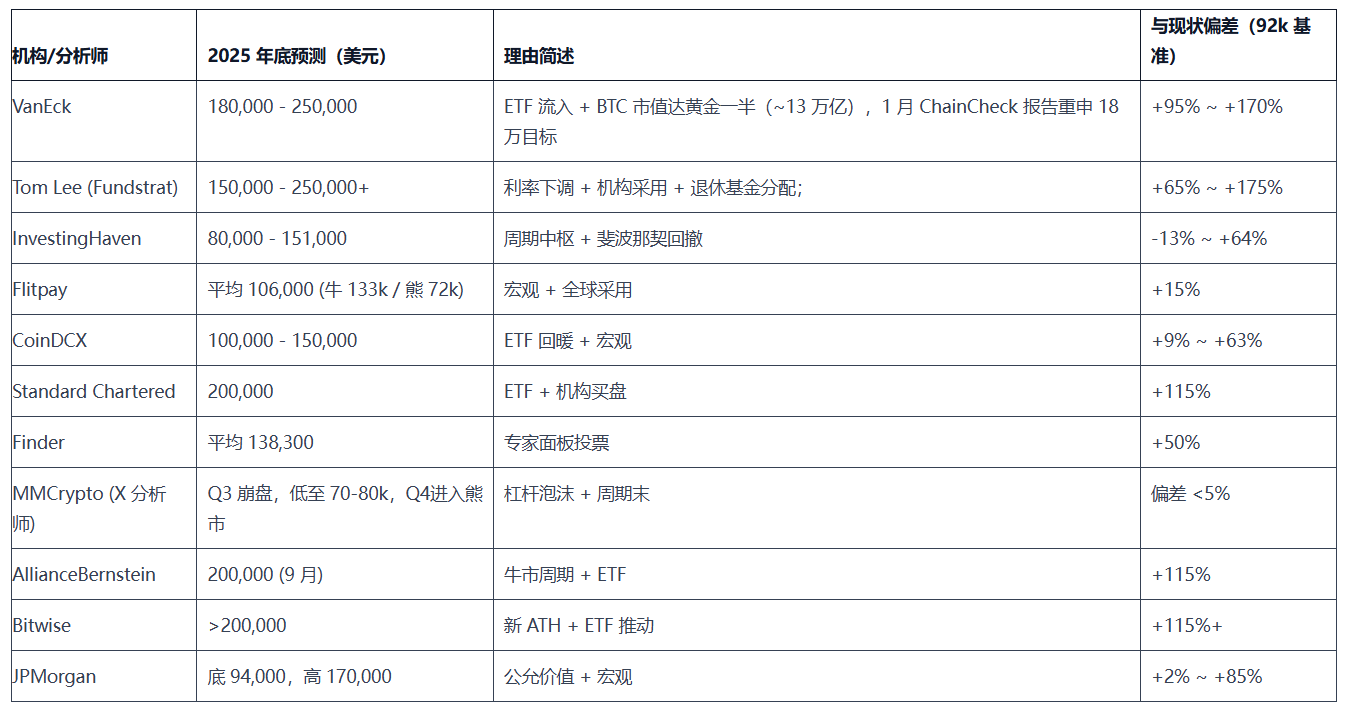下表汇总了11家主流机构和分析师的年初预测,对比当前价格(92,000美元),偏差一目了然: