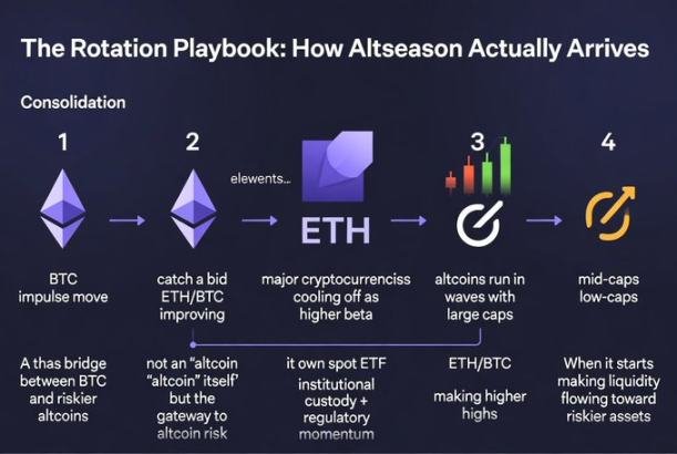 现实是流动性分层次进入加密市场,而非同时涌入。主流币可以持续上涨数周,而山寨币却横盘不动。这不是市场结构问题,这只是资本流动的运作方式。你越早接受这一点,当真正的轮动到来时,你就越能占据有利位置。