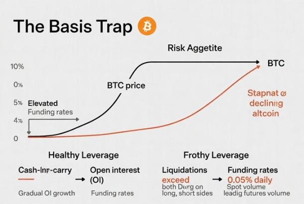 基差陷阱解释了为什么「比特币涨了所以山寨币应该跟上」常常失灵。推动比特币上涨的杠杆并不是会购买山寨币的流动性。