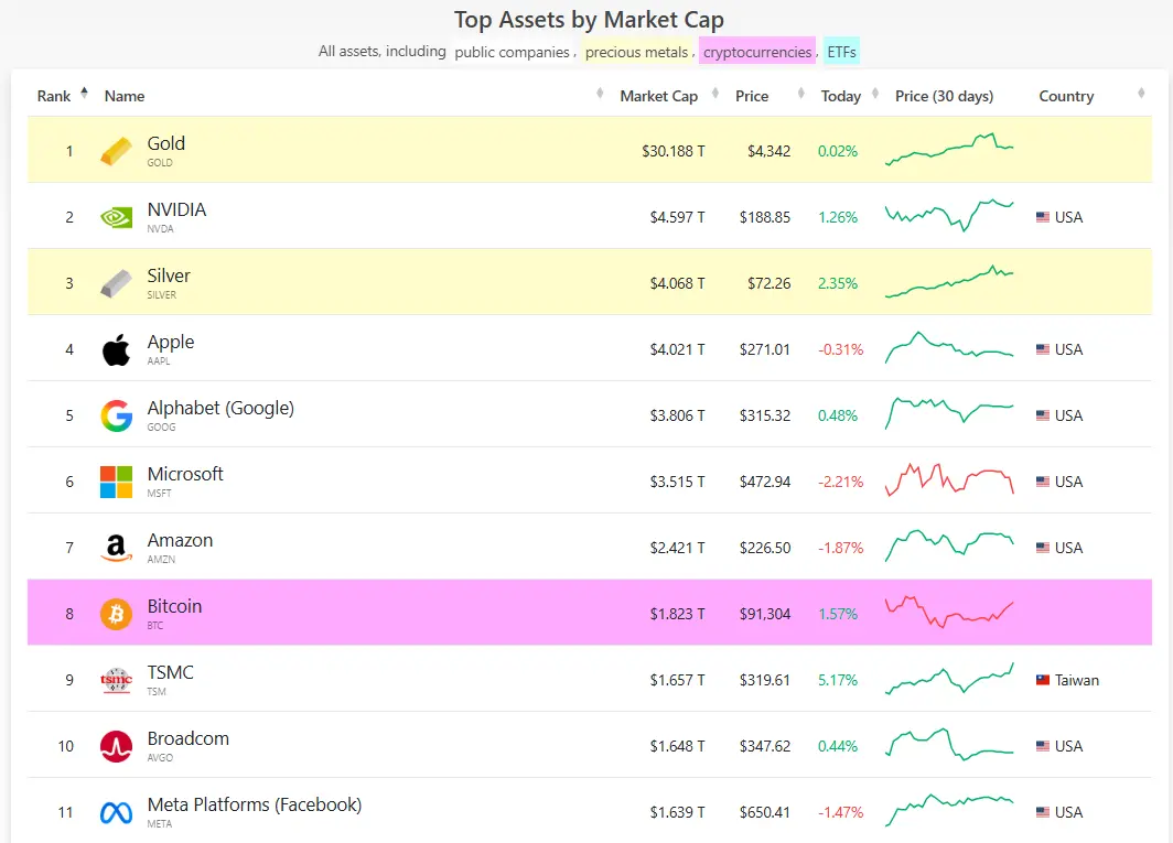 根据 CompaniesMarketCap 数据,2025 年全球前十大资产排名呈现出深刻的结构性调整。黄金以约 30 万亿美元的理论市值遥遥领先,白银市值逼近 4 万亿美元并跻身前三。科技股占据了排行榜中段,而比特币市值约为 1.8 万亿美元,排名滑落至第八位。
