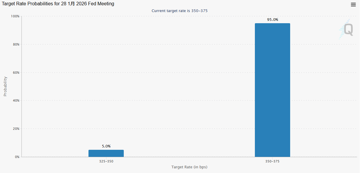 ● 非农数据公布后,市场迅速作出反应。CME联邦基金利率期货显示,市场预期1月降息25个基点的概率从11%骤降至仅剩5%,而维持利率不变的概率则跃升至95%。